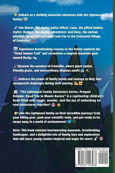 Join the extraordinary Lighthouse family on an unforgettable mountain adventure filled with magic, excitement, and heartwarming moments! ¿ Meet the Lighthouse family: Baxter, the responsible police officer; Luna, the gifted fashion stylist; Dodger, the cheeky and adventurous 12-year-old; and Zoey, the calm and science-loving 9-year-old. ¿ Enjoy this captivating road trip filled with excitement, wonder, and family bonds. ¿ Enchanting encounters with magical creatures and breathtaking landscapes. ¿ A heartwarming exploration of friendship, acceptance, and courage. ¿ A delightful blend of adventure, fantasy, and heartwarming moments for readers of all ages. ¿ Join the Lighthouse family as they prepare for a new chapter full of challenges and adventures. Don't miss out on this enchanting tale of the Lighthouse family's incredible journey through the mountains and the magical village of Crestville!