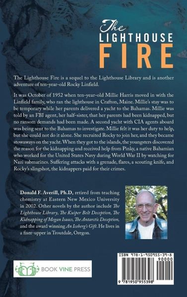 The Lighthouse Fire is a sequel to the Lighthouse Library and is another adventure of ten-year-old Rocky Linfield. It was October of 1952 when ten-year-old Millie Harris moved in with the Linfield family, who ran the lighthouse in Crafton, Maine. Millie's stay was to be temporary while her parents delivered a yacht to the Bahamas. Millie was told by an FBI agent, her half-sister, that her parents had been kidnapped, but no ransom demands had been made. A second yacht with CIA agents aboard was being sent to the Bahamas to investigate. Millie felt it was her duty to help, but she could not do it alone. She recruited Rocky to join her, and they became stowaways on the yacht. When they got to the islands, the youngsters discovered the reason for the kidnapping and received help from Pinky, a native Bahamian who worked for the United States Navy during World War II by watching for Nazi submarines. Suffering attacks with a grenade, flares, a scouting knife, and Rocky's slingshot, the kidnappers paid for their crimes.