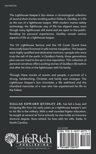 The Lighthouse Keeper's Son shares a chronological collection of several short stories recalling author Dallas E. Quidley Jr.'s life as the son of a lighthouse keeper. With modern marine safety technology, the lighthouse way of life has slipped away, even though many lighthouses still stand and are open to the public. Recalling his personal experiences, Quidley reveals various aspects of life as a lighthouse keeper. The US Lighthouse Service and the US Coast Guard have historically been foremost in safe marine navigation. The keepers were highly qualified and dedicated mariners-people who were truly the salt of the earth. In Quidley's family, three generations plus one son tried to live up to that reputation. This collection of personal narratives offers exciting stories of Quidley's life before and after his time in the lighthouses with his family. Through these stories of events and people, a portrait of a strong, hardworking, Christian and family man emerges. The Lighthouse Keeper's Son chronicles a life well-lived and the cherished memories of a man who has experienced his life to the fullest.