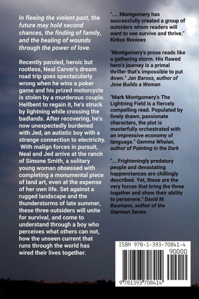 In fleeing the violent past, the future may hold second chances, the finding of family, and the healing of wounds through the power of love. Recently paroled, heroic but rootless, Neal Carver's dream road trip goes spectacularly wrong when he wins a poker game and his prized motorcycle is stolen by a murderous couple. Hellbent to regain it, he's struck by lightning while crossing the badlands. After recovering, he's now unexpectedly burdened with Jed, an autistic boy with a strange connection to electricity. With malign forces in pursuit, Neal and Jed arrive at the ranch of Simone, a solitary young woman obsessed with completing a monumental piece of land art, even at the expense of her own life. Set against a rugged landscape and the thunderstorms of late summer, these three outsiders will unite for survival, and come to understand through a boy who sees what others cannot, how the unseen current that runs through the world has wired their lives together.