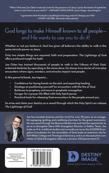 "Arise and claim your destiny as a vessel through which the Holy Spirit can release The Lightnings of God!" God longs to make Himself known to all people—and He wants to use you to do it! Whether or not you believe it, God has given all believers the ability to walk in the same miracle-power as Jesus. Only two simple things are required: faith and preparation. The Lightnings of God offers profound insight for both. Joe Oden has trained thousands of people to walk in the fullness of their God-ordained destinies by operating in the miraculous. He shares true stories of everyday encounters where signs, wonders and miracles impact real people. In this powerful book, Joe imparts… Confidence for laying hands on the sick, and expecting healing. Strategy on positioning yourself for encounters with the fire of God. Boldness to prophesy and move in prophetic evangelism. Hunger for a prayer life filled with Holy-Spirit power. Practical tools for releasing God-encounters to the people around you. So arise and claim your destiny as a vessel through which the Holy Spirit can release The Lightnings of God!