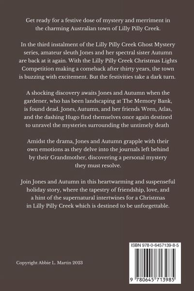 Get ready for a festive dose of mystery and merriment in the charming Australian town of Lilly Pilly Creek. In the third instalment of the Lilly Pilly Creek Ghost Mystery series, amateur sleuth Jones and her spectral sister Autumn are back at it again. With the Lilly Pilly Creek Christmas Lights Competition making a comeback after thirty years, the town is buzzing with excitement. But the festivities take a dark turn. A shocking discovery awaits Jones and Autumn when the gardener, who has been landscaping at The Memory Bank, is found dead. Jones, Autumn, and her friends Wren, Atlas, and the dashing Hugo find themselves once again destined to unravel the mysteries surrounding the untimely death. Amidst the drama, Jones and Autumn grapple with their own emotions as they delve into the journals left behind by their Grandmother, discovering a personal mystery they must resolve. Join Jones and Autumn in this heartwarming and suspenseful holiday story, where the tapestry of friendship, love, and a hint of the supernatural intertwines for a Christmas in Lilly Pilly Creek which is destined to be unforgettable.