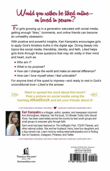 For many girls growing up in a generation saturated with social media, seeking "likes", comments, and friends online can become an obsession. Liked, written by author and mom of four daughters Kari Kampakis, offers positive, powerful insights to help girls build lasting relationships and navigate the digital age to break unhealthy obsessions with social media. Kari Kampakis has shared her tips and insight on the TODAY Show, HuffPost, and Yahoo! News. The topics covered in Liked are: Living for God's approval, not human approval Cultivating a true identity Using social media wisely Building a positive reputation online Spreading kindness, love, and compassion Distinguishing online friends from real friends Building deep connections that last Handling rejection, criticism, and volatile emotions Activating your Christian faith Making an eternal difference, not a temporary splash. With relatable age appropriate text, Liked will help: Girls, ages 11-18, to understand how to channel their talents and energies into things with eternal value and, in the process, find the love, friendships, confidence, and strength of character they desire Start great conversations that can quickly unite mothers, daughters, sisters, and friends Small group and youth group discussions for tweens and teens Kari Kampakis' Liked speaks to the female heart to address the need for approval with wisdom, hope, and grace.