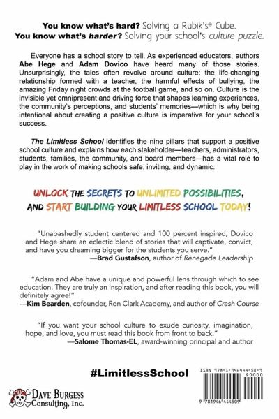 You know what's hard? Solving a Rubik's® Cube. You know what's harder? Solving your school's culture puzzle. Everyone has a school story to tell. As experienced educators, authors Abe Hege and Adam Dovico have heard many of those stories. Unsurprisingly, the tales often revolve around culture: the life-changing relationship formed with a teacher, the harmful effects of bullying, the amazing Friday night crowds at the football game, and so on. Culture is the invisible yet omnipresent and driving force that shapes learning experiences, the community's perceptions, and students' memories-which is why being intentional about creating a positive culture is imperative for your school's success. The Limitless School identifies the nine pillars that support a positive school culture and explains how each stakeholder-teachers, administrators, students, families, the community, and board members-has a vital role to play in the work of making schools safe, inviting, and dynamic. Unlock the secrets to unlimited possibilities, and start building your Limitless School today! "Unabashedly student centered and 100 percent inspired, Dovico and Hege share an eclectic blend of stories that will captivate, convict, and have you dreaming bigger for the students you serve." -Brad Gustafson, author of Renegade Leadership "Adam and Abe have a unique and powerful lens through which to see education. They are truly an inspiration, and after reading this book, you will definitely agree!" -Kim Bearden, cofounder, Ron Clark Academy and author of Crash Course "If you want your school culture to exude curiosity, imagination, hope, and love, you must read this book from front to back." -Salome Thomas-EL, award-winning principal and author #LimitlessSchool