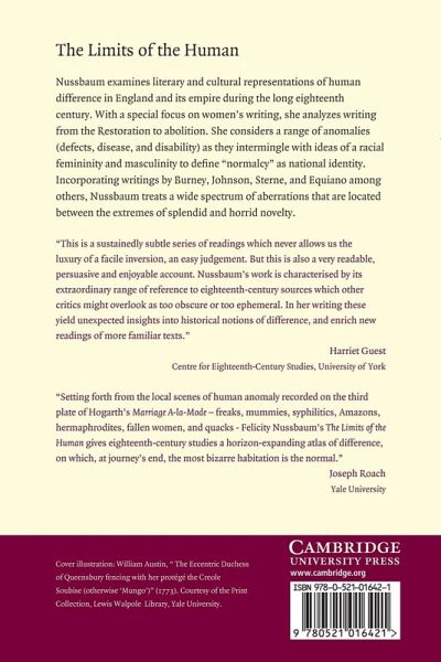 In this book, Felicity Nussbaum examines literary and cultural representations of human difference in England and its empire during the long eighteenth century. With a special focus on women's writing, Nussbaum analyzes canonical and lesser-known novels and plays from the Restoration to abolition. She considers a range of anomalies (defects, disease, and disability) as they intermingle with ideas of femininity, masculinity, and race to define 'normalcy' as national identity. Incorporating writings by Behn, Burney, and the Bluestockings, as well as Southerne, Shaftesbury, Johnson, Sterne, and Equiano, Nussbaum treats a range of disabilities - being mute, blind, lame - and physical oddities such as eunuchism and giantism as they are inflected by emerging notions of a racial femininity and masculinity. She shows that these corporeal features, perceived as aberrant and extraordinary, combine in the popular imagination to reveal a repertory of differences located between the extremes of splendid and horrid novelty.