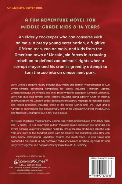 A fun adventure novel for middle-grade kids 8-14-and young-at-heart adults An elderly zookeeper who can converse with animals, a pretty young veterinarian, a fugitive African teen, zoo animals, and kids from the American town of Lincoln join forces in a rousing rebellion to defend zoo animals' rights when a corrupt mayor and his cronies greedily attempt to turn the zoo into an amusement park. The Lincoln Zoo Rebellion deals with animal rights and preservation in an entertaining and humorous way, making it an engaging read for kids from 8 to 14-and young-at-heart adults. It connects with today's kids, who are more aware than previous generations because of the internet and faster moving times. It makes learning more exciting and fun. PRAISE FOR THE LINCOLN ZOO REBELLION "The Lincoln Zoo Rebellion is amazing! The characters are well-developed, the storyline will draw you in, and the fantasy to real life connection is amazing. One of the best books I have read." -Owen, age 10 (6th grade) "I loved this wonderful tale. The hero, Reggie, is a positive Pied Piper. This exciting story helps to foster children's ability to handle tough competition and greed and learn about standing up for one's beliefs with grit, generosity, humor, and love. I recommend it highly and enjoyed it enormously." -Judith Warren, PhD., Psychologist "It's a terrific book! It will have broad appeal to both boys and girls, especially animal lovers (most kids like animals). It's a fast-paced story-very humorous with witty and wonderfully colorful descriptions. I loved Abby Sweet going into the lion's cage, Reggie learning animal languages, and the animals escaping from their cages." I had some good laughs in between holding my breath as the action accelerated." -Alice Kaplan, Librarian "The Lincoln Zoo Rebellion was really creative with the animal voices and was cool that the kids wanted to help make a rebellion. Also, you feel a line of suspense growing and thickening, then it pauses, and a new suspense starts. I learned a lot about animals and especially liked Reggie the Zoo Keeper, Teeny Tiny, and Little Max, and the zoo animals-the Penguins, Rambo the Hippo, Leslie the Ring-tailed Lemur, and the Spotted Hyenas." -Sophia, age 11 (5th grade)