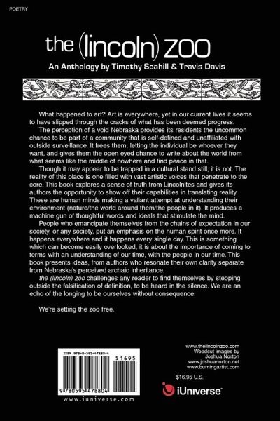 What happened to art? Art is everywhere, yet in our current lives it seems to have slipped through the cracks of what has been deemed progress. The perception of a void Nebraska provides its residents the uncommon chance to be part of a community that is self-defined and unaffiliated with outside surveillance. It frees them, letting the individual be whoever they want, and gives them the open eyed chance to write about the world from what seems like the middle of nowhere and find peace in that. Though it may appear to be trapped in a cultural stand still; it is not. The reality of this place is one filled with vast artistic voices that penetrate to the core. This book explores a sense of truth from Lincolnites and gives its authors the opportunity to show off their capabilities in translating reality. These are human minds making a valiant attempt at understanding their environment (nature/the world around them/the people in it). It produces a machine gun of thoughtful words and ideals that stimulate the mind. People who emancipate themselves from the chains of expectation in our society, or any society, put an emphasis on the human spirit once more. It happens everywhere and it happens every single day. This is something which can become easily overlooked, it is about the importance of coming to terms with an understanding of our time, with the people in our time. This book presents ideas, from authors who resonate their own clarity separate from Nebraska's perceived archaic inheritance. the (lincoln) zoo challenges any reader to find themselves by stepping outside the falsification of definition, to be heard in the silence.We are an echo of the longing to be ourselves without consequence. We're setting the zoo free.