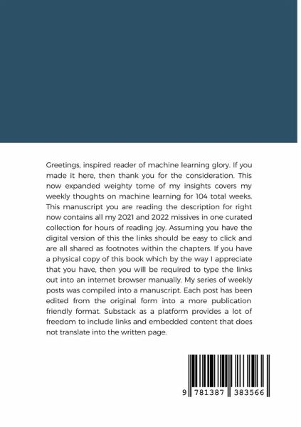 Greetings, inspired reader of machine learning glory. If you made it here, then thank you for the consideration. This now expanded weighty tome of my insights covers my weekly thoughts on machine learning for 104 total weeks. This manuscript you are reading the description for right now contains all my 2021 and 2022 missives in one curated collection for hours of reading joy. Assuming you have the digital version of this the links should be easy to click and are all shared as footnotes within the chapters. If you have a physical copy of this book which by the way I appreciate that you have, then you will be required to type the links out into an internet browser manually. My series of weekly posts was compiled into a manuscript. Each post has been edited from the original form into a more publication friendly format. Substack as a platform provides a lot of freedom to include links and embedded content that does not translate into the written page.