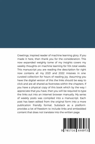 Greetings, inspired reader of machine learning glory. If you made it here, then thank you for the consideration. This now expanded weighty tome of my insights covers my weekly thoughts on machine learning for 104 total weeks. This manuscript you are reading the description for right now contains all my 2021 and 2022 missives in one curated collection for hours of reading joy. Assuming you have the digital version of this the links should be easy to click and are all shared as footnotes within the chapters. If you have a physical copy of this book which by the way I appreciate that you have, then you will be required to type the links out into an internet browser manually. My series of weekly posts was compiled into a manuscript. Each post has been edited from the original form into a more publication friendly format. Substack as a platform provides a lot of freedom to include links and embedded content that does not translate into the written page.