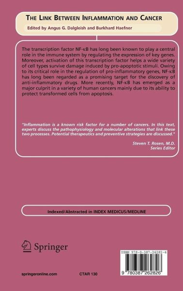 The transcription factor NF-kB has long been known to play a central role in the immune system by regulating the expression of key genes. Moreover, activation of this transcription factor helps a wide variety of cell types survive damage induced by pro-apoptotic stimuli. Owing to its critical role in the regulation of pro-inflammatory genes, NF-kB has long been regarded as a promising target for the discovery of anti-inflammatory drugs. More recently, NF-kB has emerged as a major culprit in a variety of human cancers mainly due to its ability to protect transformed cells from apoptosis. This finding should not have come as a surprise since there exists a link between inflammation and cancer which was already suggested by Galen and later demonstrated by Virchow. This link, of crucial importance for the design of novel strategies for cancer treatment, is the topic of this book.