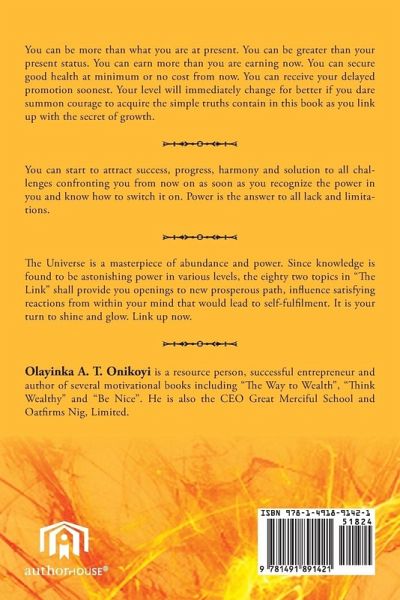 There is clear evidence of discontent and disconnection in the life of many individuals, resulting to lack and limitations. The population of the poor is increasing in the midst of plenty. The hardworking people have little or nothing to show for their effort. The rich also cry profusely for one need or another. Those who claim to be men of God have no general answer to the immediate needs of their congregation; all these are proofs of an urgent need for a more pragmatic approach to solving our numerous problems. We urgently require knowing what links us to solutions and what connects us to the main domain of power. We are not totally impervious to the facts, but we need to get used to it. For instance, we know the air we breathe, but not all of us know the contents of this vitality of life. We know the mind, as in man, but many are ignorant of it as the powerhouse creative theater and the link to the spiritual mass where the creations and the Creator meet. We know the world, but many are yet to know that we are the world; we are the children of the most high God, so we should start giving what we want. If you need love, give it first. If you need wealth, give service. Whatsoever you need, be prepared to pay the price, and link it up with what you have. The world is a masterpiece of abundance. There is enough wealth to go round in the universe. Each and every one can be what he or she desires to be. All we need to know is how to link our inheritance, how to connect with our aspirations, and how to attract our yearnings. The eighty-two topics in this book will assist you to link up with yourself, connect with your God, and be able to attract solutions and the best things of life. Read passionately, keep thinking, and keep linking.
