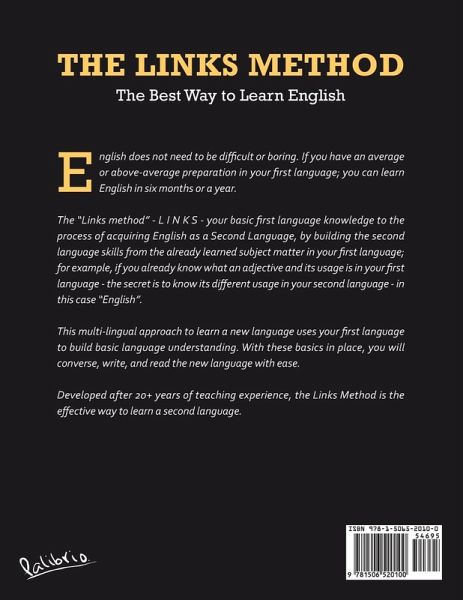 English does not need to be difficult or boring. If you have an average or above-average preparation in your first language; you can learn English in six months or a year. The Links method - L I N K S - your basic first language knowledge to the process of acquiring English as a Second Language, by building the second language skills from the already learned subject matter in your first language; for example, if you already know what an adjective and its usage is in your first language - the secret is to know its different usage in your second language - in this case English. This multi-lingual approach to learn a new language uses your first language to build basic language understanding. With these basics in place, you will converse, write, and read the new language with ease. Developed after 20+ years of teaching experience, the Links Method is the effective way to learn a second language.