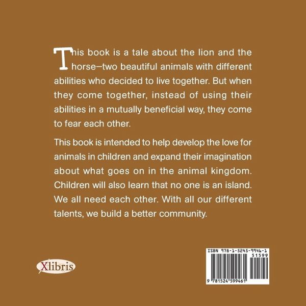 This book is a tale about the lion and the horse—two beautiful animals with different abilities who decided to live together. But when they come together, instead of using their abilities in a mutually beneficial way, they come to fear each other. This book is intended to help develop the love for animals in children and expand their imagination about what goes on in the animal kingdom. Children will also learn that no one is an island. We all need each other. With all our different talents, we build a better community.