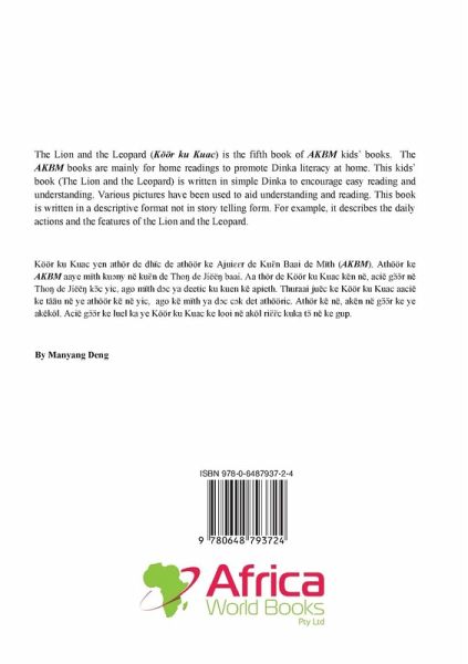 The Lion and the Leopard (Köör ku Kuac) is the fifth book of AKBM kids' books. The AKBM books are mainly for home readings to promote Dinka literacy at home. This kids' book (The Lion and the Leopard) is written in simple Dinka to encourage easy reading and understanding. Various pictures have been used to aid understanding and reading. This book is written in a descriptive format not in story telling form. For example, it describes the daily actions and the features of the Lion and the Leopard. Köör ku Kuac yen athör de dhïc de athöör ke Ajui¿¿r de Kü n Baai de Mïth (AKBM). Athöör ke AKBM aaye mïth küny në kü n de Thö de Jiëë¿ baai. Aa thör de Köör ku Kuac kën në, acië g¿ ¿ r në Thö de Jiëë¿ k¿ c yic, ago mïth d¿c ya deetic ku kuen kë apieth. Thuraai juëc ke Köör ku Kuac aacië ke tääu në ye athöör kë në yic, ago kë mïth ya d¿c c¿k det athööric. Athör kë në, akën në g¿ ¿ r ke ye akëköl. Acië g¿ ¿ r ke luel ka ye Köör ku Kuac ke looi në aköl ri¿ ¿ c kuka t¿ në ke gup.