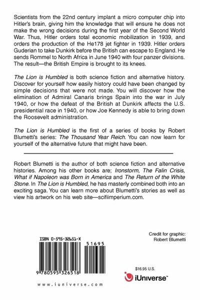 Scientists from the 22nd century implant a micro computer chip into Hitler's brain, giving him the knowledge that will ensure he does not make the wrong decisions during the first year of the Second World War. Thus, Hitler orders total economic mobilization in 1939, and orders the production of the He178 jet fighter in 1939. Hitler orders Guderian to take Dunkirk before the British can escape to England. He sends Rommel to North Africa in June 1940 with four panzer divisions. The result--the British Empire is brought to its knees. The Lion is Humbled is both science fiction and alternative history. Discover for yourself how easily history could have been changed by simple decisions that were not made. You will discover how the elimination of Admiral Canaris brings Spain into the war in July 1940, or how the defeat of the British at Dunkirk affects the U.S. presidential race in 1940, or how Joe Kennedy is able to bring down the Roosevelt administration. The Lion is Humbled is the first of a series of books by Robert Blumetti's series: The Thousand Year Reich. You can now learn for yourself of the alternative future that might have been.