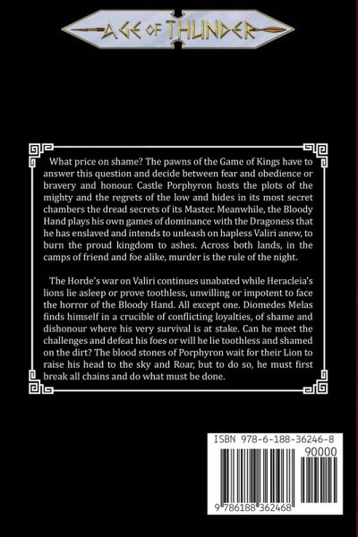What price on shame? The pawns of the Game of Kings have to answer this question and decide between fear and obedience or bravery and honour. Castle Porphyron hosts the plots of the mighty and the regrets of the low and hides in its most secret chambers the dread secrets of its Master. Meanwhile, the Bloody Hand plays his own games of dominance with the Dragoness that he has enslaved and intends to unleash on hapless Valiri anew, to burn the proud kingdom to ashes. Across both lands, in the camps of friend and foe alike, murder is the rule of the night. The Horde's war on Valiri continues unabated while Heracleia's lions lie asleep or prove toothless, unwilling or impotent to face the horror of the Bloody Hand. All except one. Diomedes Melas finds himself in a crucible of conflicting loyalties, of shame and dishonour where his very survival is at stake. Can he meet the challenges and defeat his foes or will he lie toothless and shamed on the dirt? The blood stones of Porphyron wait for their Lion to raise his head to the sky and Roar, but to do so, he must first break all chains and do what must be done.