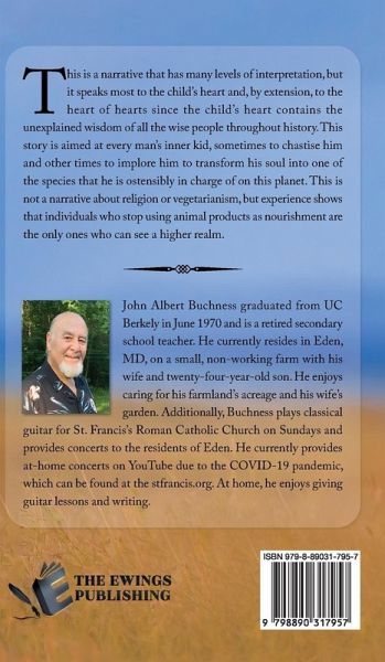 This is a narrative that has many levels of interpretation, but it speaks most to the child's heart and, by extension, to the heart of hearts since the child's heart contains the unexplained wisdom of all the wise people throughout history. This story is aimed at every man's inner kid, sometimes to chastise him and other times to implore him to transform his soul into one of the species that he is ostensibly in charge of on this planet. This is not a narrative about religion or vegetarianism, but experience shows that individuals who stop using animal products as nourishment are the only ones who can see a higher realm.