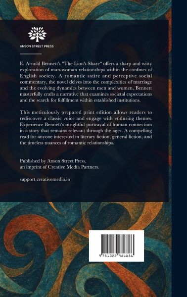 E. Arnold Bennett's "The Lion's Share" offers a sharp and witty exploration of man-woman relationships within the confines of English society. A romantic satire and perceptive social commentary, the novel delves into the complexities of marriage and the evolving dynamics between men and women. Bennett masterfully crafts a narrative that examines societal expectations and the search for fulfillment within established institutions. This meticulously prepared print edition allows readers to rediscover a classic voice and engage with enduring themes. Experience Bennett's insightful portrayal of human connection in a story that remains relevant through the ages. A compelling read for anyone interested in literary fiction, general fiction, and the timeless nuances of romantic relationships. This work has been selected by scholars as being culturally important, and is part of the knowledge base of civilization as we know it. This work is in the public domain in the United States of America, and possibly other nations. Within the United States, you may freely copy and distribute this work, as no entity (individual or corporate) has a copyright on the body of the work. Scholars believe, and we concur, that this work is important enough to be preserved, reproduced, and made generally available to the public. We appreciate your support of the preservation process, and thank you for being an important part of keeping this knowledge alive and relevant.