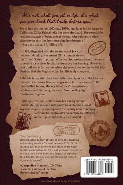 ¿¿¿¿¿ "A beautifully touching story of a tenacious woman!" - Reader Review ___ "It's not what you get in life, it's what you give back that truly defines you." Set in Iran during the 1960s and 1970s, and later in Los Angeles, California, Zhila Shirazi tells her story firsthand. She reveals the real-life struggle of being a deaf woman who refuses to allow adversity to stop her from reaching her dreams of living a normal and fulfilling life. In 1985, disgusted with the treatment of Jews by the new Islamic government, Zhila immigrates to the United States in pursuit of better circumstances and a chance to receive a cochlear implant to improve her hearing. However, it isn't until she is forty-nine, when she meets her soulmate, Mickey Daniels, that she begins to feel her life truly complete. A decade later, after they have fallen deeply in love, Zhila learns that she is suffering from an aggressive form of cancer. In the months that follow, Mickey becomes Zhila's primary caretaker, and the two grow ever closer as they fight the disease together. Right up to the end, Zhila shows her caring nature, innate intelligence, and will power to overcome almost any challenge. Her courage and the beauty of her memory is certain to inspire all who venture to follow her on their quest for a truly meaningful life.