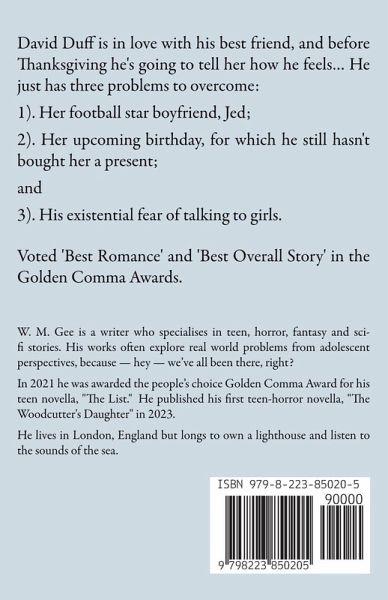 David Duff is in love with his best friend, and before Thanksgiving he's going to tell her how he feels… He just has three problems to overcome: 1). Her football star boyfriend, Jed; 2). Her upcoming birthday, for which he still hasn't bought her a present; and 3). His existential fear of talking to girls. Voted 'Best Romance' and 'Best Overall Story' in the Golden Comma Awards.