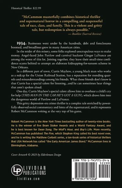 1934. Businesses went under by the hundreds, debt and foreclosures boomed, and breadlines grew in many American cities. In the midst of this misery, some folks explored unscrupulous ways to make money. Angel-faced John Partlow and carnival huckster Ginger LaFrance are among the worst of this lot. Joining together, they leave their small time confidence scams behind to attempt an elaborate kidnapping-for-ransom scheme in New Orleans. In a different part of town, Curtis Mayhew, a young black man who works as a redcap for the Union Railroad Station, has a reputation for mending quarrels and misunderstandings among his friends. What those friends don't know is that Curtis has a special talent for listening...and he can sometimes hear things that aren't spoken aloud. One day, Curtis Mayhew's special talent allows him to overhear a child's cry for help (THIS MAN IN THE CAR HE'S GOT A GUN), which draws him into the dangerous world of Partlow and LaFrance. This gritty depression-era crime thriller is a complex tale enriched by powerfully observed social commentary and hints of the supernatural, and it represents Robert McCammon writing at the very top of his game.
