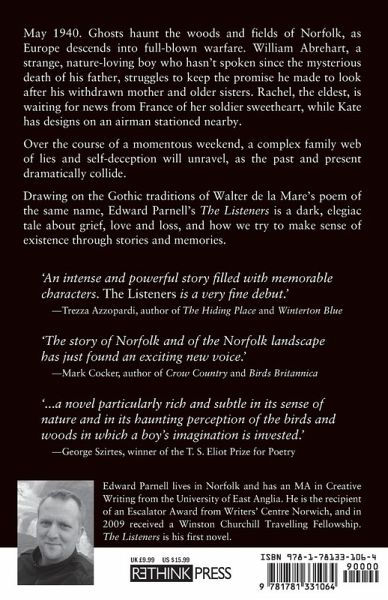 May 1940. Ghosts haunt the woods and fields of Norfolk, as Europe descends into full-blown warfare. William Abrehart, a strange, nature-loving boy who hasn't spoken since the mysterious death of his father, struggles to keep the promise he made to look after his withdrawn mother and older sisters. Rachel, the eldest, is waiting for news from France of her soldier sweetheart, while Kate has designs on an airman stationed nearby. Over the course of a momentous weekend, a complex family web of lies and self-deception will unravel, as the past and present dramatically collide. Drawing on the Gothic traditions of Walter de la Mare's poem of the same name, Edward Parnell's 'The Listeners' is a dark, elegiac tale about grief, love and loss, and how we try to make sense of existence through stories and memories.