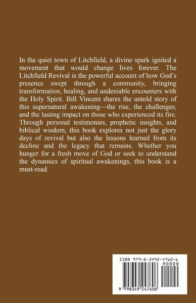 In the quiet town of Litchfield, a divine spark ignited a movement that would change lives forever. The Litchfield Revival is the powerful account of how God's presence swept through a community, bringing transformation, healing, and undeniable encounters with the Holy Spirit. Bill Vincent shares the untold story of this supernatural awakening-the rise, the challenges, and the lasting impact on those who experienced its fire. Through personal testimonies, prophetic insights, and biblical wisdom, this book explores not just the glory days of revival but also the lessons learned from its decline and the legacy that remains. Whether you hunger for a fresh move of God or seek to understand the dynamics of spiritual awakenings, this book is a must-read.