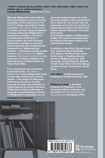 Amid growing recognition that Wittgenstein's philosophy has important implications for literary studies, this book brings together twenty-one articles by the most prominent figures in the field. Eighteen of the articles are published here for the first time. "The Literary Wittgenstein" applies the approach of Wittgenstein to core areas of literary theory, including poetry, deconstruction, the ethical value of literature, and the nature and logic of fictional discourse. The literary dimension of Wittgenstein's own writings is also explored, such as the authorial strategy of the "Tractatus," and writing and method in the" Philosophical Investigations." Major literary figures discussed in the book include William Faulkner, Joseph Conrad, and Friedrich Holderlin. By mapping out the foundations of a new approach to literature, "The Literary Wittgenstein" will be essential reading for anyone interested in the relevance and application of Wittgenstein's thought to literary theory, aesthetics, and the philosophy of language and logic.