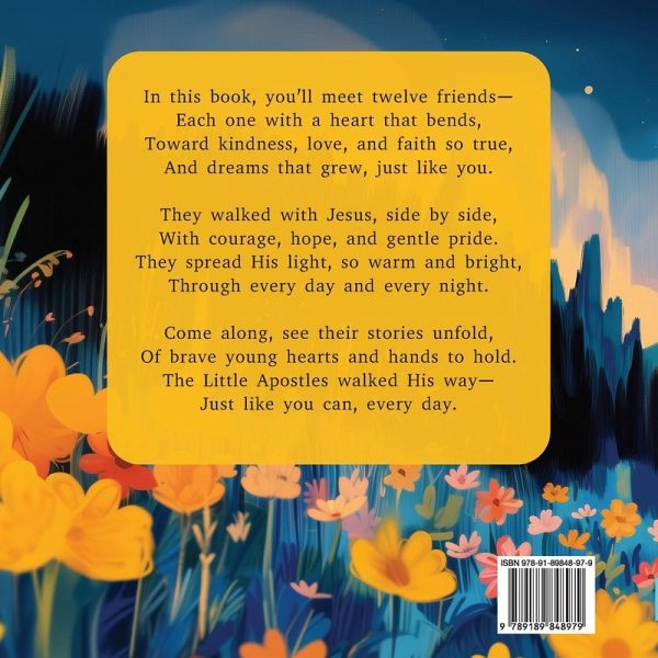 Imagine your child discovering the joy of faith, side by side with the twelve chosen followers of Jesus. The Little Apostles is a children religious book and a beautifully crafted journey into the hearts of the apostles as young children, capturing their love, devotion, and courage. This is more than a story-it's an inspiring path that gently guides little ones to understand the virtues that shaped the early disciples of Christ. Through tender rhymes and captivating illustrations, each page offers an intimate look at the apostles' unique spirits and the special friendship they shared with Jesus. This book invites children to see themselves in Peter's bravery, Andrew's kindness, John's boundless love, and the steadfast faith that united them all. By walking alongside these young apostles, your child will begin to feel that same light in their own heart-a light that grows with every act of love, every small prayer, every step of faith. The Little Apostles is a story that families will treasure, a powerful tool for nurturing a child's relationship with Christ and building a foundation of faith. Whether shared during bedtime, Sunday mornings, or quiet family moments, this book promises to deepen a child's connection to the timeless message of Jesus' love and compassion. Let The Little Apostles be the start of a journey that will bless and inspire your child for years to come.