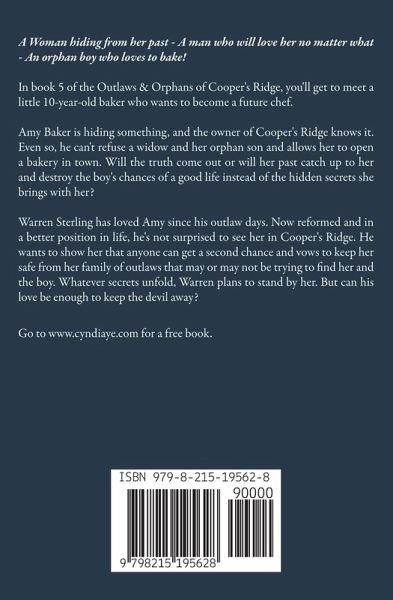 A Woman hiding from her past - A man who will love her no matter what - An orphan boy who loves to bake! In book 5 of the Outlaws & Orphans of Cooper's Ridge, you'll get to meet a little 10-year-old baker who wants to become a future chef. Amy Baker is hiding something, and the owner of Cooper's Ridge knows it. Even so, he can't refuse a widow and her orphan son and allows her to open a bakery in town. Will the truth come out or will her past catch up to her and destroy the boy's chances of a good life instead of the hidden secrets she brings with her? Warren Sterling has loved Amy since his outlaw days. Now reformed and in a better position in life, he's not surprised to see her in Cooper's Ridge. He wants to show her that anyone can get a second chance and vows to keep her safe from her family of outlaws that may or may not be trying to find her and the boy. Whatever secrets unfold, Warren plans to stand by her. But can his love be enough to keep the devil away?