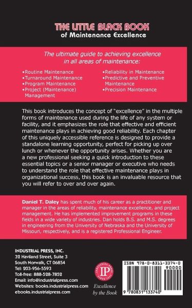 This book provides an introduction to the concept of "excellence" in the several forms of maintenance used during the life of any system or facility. Unlike most books that tend to focus on just one of the areas of maintenance, this book looks at all the distinct forms of maintenance including: Routine Maintenance, Turnaround Maintenance, Program Maintenance, Project (Maintenance) Management, Reliability in Maintenance, Predictive and Preventive Maintenance, and Precision Maintenance. Rather than simply focusing on "how to get the work done", this concise resource focuses on Maintenance Excellence and meeting its objectives more effectively and more efficiently. Uniquely designed for busy people who want and need to learn more about maintenance excellence but have a limited amount of time to do so, each chapter is designed to provide a stand-alone learning opportunity for individuals who have an opportunity to pick the book up over lunch or whenever the opportunity arises. Additionally, it emphasizes the part that effective and efficient maintenance plays in achieving good reliability so it provides an excellent companion for The Little Black Book of Reliability Management which was designed to be used in the same manner. This set of books is intended to provide the young professionals working in this area with a quick introduction to all the subjects they will need to learn. It is also intended for more senior managers and executives who are not experts in either maintenance or reliability, but need to be conversant with its elements. Features * Provides the reader with a concise yet informative description of all the various forms of maintenance. * Highlights the important elements of each of the various forms of maintenance and how to go about organizing those elements in his plant or facility. * Offers the reader with the tools needed to integrate initiatives leading to improved reliability with each kind of maintenance. * Provides the reader with tools needed to enhance effectiveness and efficiency in each kind of maintenance. * Gives both new and more experienced plant and shop personnel with a tool they can use to develop a consistent understanding of maintenance excellence so they can identify common goals and consistent objectives. * Includes forms and formats that can be used for the following: Job Delay Survey, Accountability-Responsibility Matrix, Role Description, Project Control Document, and Work Scoping Form.