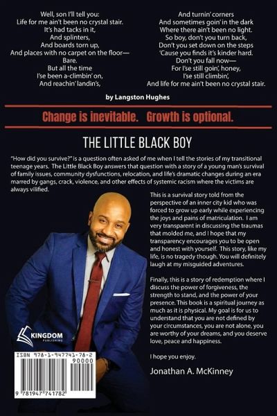 "How did you survive?" is a question often asked of me when I tell the stories of my transitional teenage years. The Little Black Boy answers that question with a story of a young man's survival of family issues, community dysfunctions, relocation, and life's dramatic changes during an era marred by gangs, crack, violence, and other effects of systemic racism where the victims are always vilified. This is a survival story told from the perspective of an inner city kid who was forced to grow up early while experiencing the joys and pains of matriculation. I am very transparent in discussing the traumas that molded me, and I hope that my transparency encourages you to be open and honest with yourself. This story, like my life, is no tragedy though. You will definitely laugh at my misguided adventures. Finally, this is a story of redemption where I discuss the power of forgiveness, the strength to stand, and the power of your presence. This book is a spiritual journey as much as it is physical. My goal is for us to understand that you are not defined by your circumstances, you are not alone, you are worthy of your dreams, and you deserve love, peace and happiness.