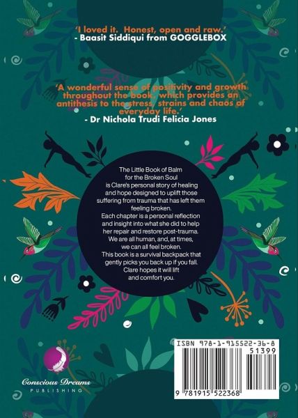 The Little Book of Balm is Clare's personal story of survival and hope designed to uplift those suffering from trauma that has left them feeling broken. Each chapter is a personal reflection and insight into what she did to help her repair, restore, and heal from trauma. We are all human, and, at times, we can all feel vulnerable and broken. This book is a survival backpack that gently picks you back up if you fall. Written in an easy-to-read style, like a friend supporting another friend, Clare hopes it will lift and comfort you.