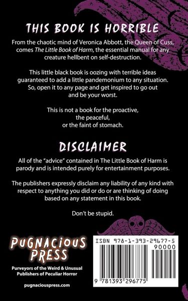 From the chaotic mind of Veronica Abbott, the Queen of Cuss, comes The Little Book of Harm, the essential manual for any creature hellbent on self-destruction. This little black book is oozing with terrible ideas guaranteed to add a little pandemonium to any situation. So, open it to any page and get inspired to go out and be your worst. This is not a book for the proactive, the peaceful, or the faint of stomach. Other titles available from Pugnacious Press: Devil's Night: Bite-Sized Horror for Halloween Poisoned Candy: Bite-sized Horror for Halloween Rancid Eggs: Bite-sized Horror for Easter Bloody Stockings: Bite-sized Horror for Christmas