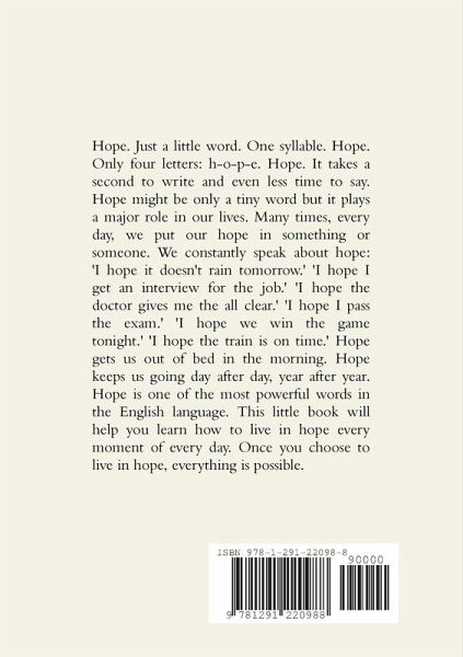 Hope. Just a little word. One syllable. Hope. Only four letters: h-o-p-e. Hope. It takes a second to write and even less time to say. Hope might be only a tiny word but it plays a major role in our lives. Many times, every day, we put our hope in something or someone. We constantly speak about hope: 'I hope it doesn't rain tomorrow.' 'I hope I get an interview for the job.' 'I hope the doctor gives me the all clear.' 'I hope I pass the exam.' 'I hope we win the game tonight.' 'I hope the train is on time.' Hope gets us out of bed in the morning. Hope keeps us going day after day, year after year. Hope is one of the most powerful words in the English language. This little book will help you learn how to live in hope every moment of every day. Once you choose to live in hope, everything is possible.