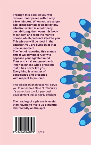 Through this booklet you will recover inner peace within only a few minutes. When you are angry, sad, disappointed or upset by any situation which is emotionally destabilizing, then open this book at random and read the mantra phrase which presents itself to you. This phrase will be ideal in the situation you are living in at that precise moment. The fact of repeating this mantra and of welcoming it fully will appease your agitated mind. Thus you shall reconnect with inner calmness while grasping that it has never left you. Everything is a matter of conscience and presence with respect to yourself. This collection of phrases will serve you to return to a state of tranquility. It's a precious tool for personal development that is highly efficient. The reading of a phrase is easier than having to make up a mantra abstractedly on the spot.