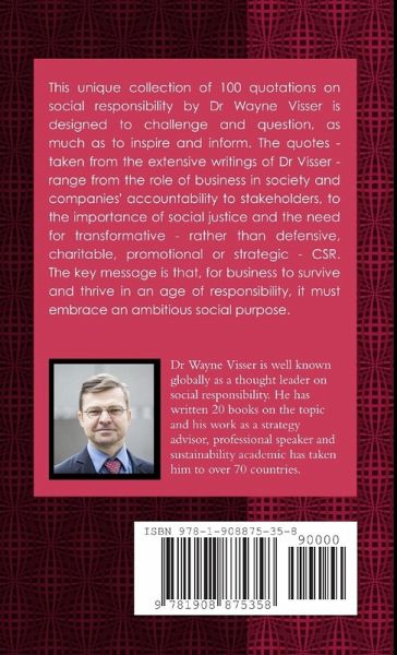 This unique collection of 100 quotations on social responsibility by Dr Wayne Visser is designed to challenge and question, as much as to inspire and inform. The quotes - taken from the extensive writings of Dr Visser - range from the role of business in society and companies' accountability to stakeholders, to the importance of social justice and the need for transformative - rather than defensive, charitable, promotional or strategic - CSR. The key message is that, for business to survive and thrive in an age of responsibility, it must embrace an ambitious social purpose.