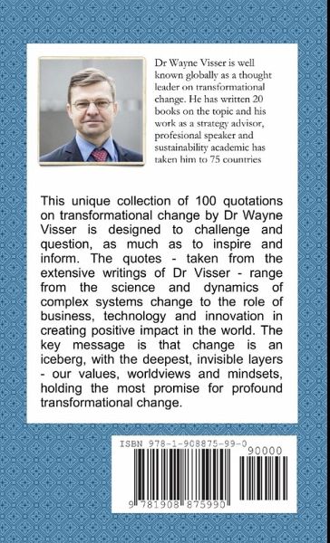 This unique collection of 100 quotations on transformational change by Dr Wayne Visser is designed to challenge and question, as much as to inspire and inform. The quotes - taken from the extensive writings of Dr Visser - range from the science and dynamics of complex systems change to the role of business, technology and innovation in creating positive impact in the world. The key message is that change is an iceberg, with the deepest, invisible layers - our values, worldviews and mindsets, holding the most promise for profound transformational change.