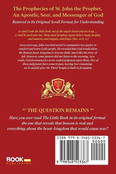 The Little Book of Revelation presents the complete prophecies of St. John the Messenger of God in a structured and easy-to-navigate format. Unlike traditional interpretations, this book uncovers how Revelation contains seven distinct endings, each offering a deeper understanding of God's ultimate plan. Many believe Revelation is one of the most challenging books in the Bible, often leading to confusion or fear. However, this book provides a clear and accessible format, allowing readers to see Revelation as a message of hope, justice, and victory-not fear. To aid comprehension, Jose has carefully added headings and subheadings without commentary, serving as quick reference points so readers can follow the prophecy with ease. While many wonder about the meaning of the end times, The Little Book of Revelation highlights a crucial truth: God's judgment is not for the godly, but for the beast kingdom-that has corrupted the earth and led the world into war and deception. Key Features of the Book: - A Simple, Shareable Format - This book is designed to be affordable and easy to distribute. Imagine asking someone, "Have you ever read The Little Book of Revelation?" and placing the truth directly into their hands. - Unveiling the Seven Endings - Many people do not realize that Revelation is structured with seven distinct endings, each revealing a different perspective of God's judgment, His victory, and the eternal kingdom. Understanding this layout makes it easier to see how the prophecy unfolds. - Revelation Is Happening Now - One of the most remarkable insights of this book is that Revelation 17:12-16 is unfolding in real time. This passage describes the rise of ten nations that will ultimately destroy the beast with fire. The signs are already appearing, and this book helps believers recognize them. - Read Revelation in Its Original Scroll Format - The traditional book format can make it difficult to see how the events of Revelation connect. This version allows readers to experience the text in a side-by-side, scroll-like format, making it easier to compare events on a scroll and grasp the bigger picture. A Call to Action The ultimate goal is to encourage believers to share Revelation with others. By purchasing copies in bundles and handing them out, we can spread hope in God's eternal kingdom, ensuring that more people understand His promise-a kingdom with no more suffering ever again that will last forever. About the Author Jose Oscar Salinas Jr. sold his business to fully dedicate himself to biblical research and writing. He has spent over 20 years compiling a Chronological Bible alongside a study of 2,000 years of Church history, paralleled with the Book of Revelation. As the founder of Unite Christians and Jews Ministries, he has traveled to ten nations confirm the book of Revelation. And is ready to debate, reason, and preparing others for the fulfillment of biblical prophecy. With over 30 years of business experience and six years of military service, Jose brings a unique perspective on history, faith, and prophecy. His mission is to help believers understand the significance of the First and Second Temples while preparing for the coming of the Third Temple-an event that will shape the future.