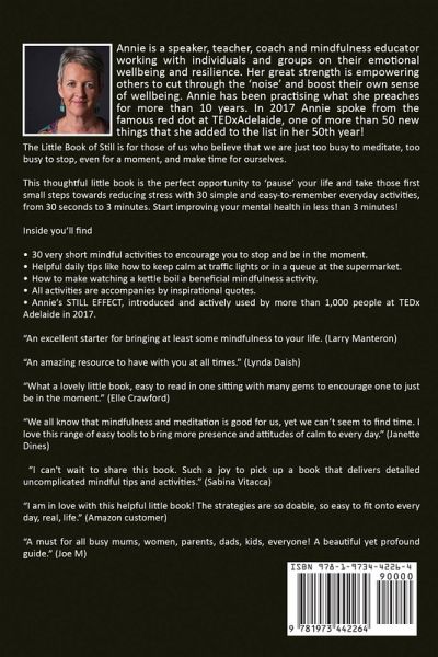 Want to reduce stress? The good news is, you already have the resources inside you, you just need to try! In this little book wellbeing practitioner Annie Harvey shares more than 30 simple activities, from 30 seconds to 3 minutes, that will bring a little stillness and calm to your busy life. These mental exercises are about giving your mind little escapes from the ever-present state of ‘doing’, introducing mindful ‘breaks’ that place you in a ‘being’ state. These are chances to simply ‘be’, to be still. With accompanying inspirational quotes, the book encourages you to take small steps towards reducing the level of stress hormones.
