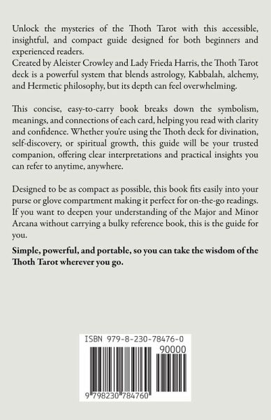 Unlock the mysteries of the Thoth Tarot with this accessible, insightful, and compact guide designed for both beginners and experienced readers. Created by Aleister Crowley and Lady Frieda Harris, the Thoth Tarot deck is a powerful system that blends astrology, Kabbalah, alchemy, and Hermetic philosophy, but its depth can feel overwhelming. This concise, easy-to-carry book breaks down the symbolism, meanings, and connections of each card, helping you read with clarity and confidence. Whether you're using the Thoth deck for divination, self-discovery, or spiritual growth, this guide will be your trusted companion, offering clear interpretations and practical insights you can refer to anytime, anywhere. Designed to be as compact as possible, this book fits easily into your purse or glove compartment making it perfect for on-the-go readings. If you want to deepen your understanding of the Major and Minor Arcana without carrying a bulky reference book, this is the guide for you. Simple, powerful, and portable, so you can take the wisdom of the Thoth Tarot wherever you go.