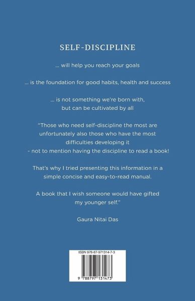 SELF-DISCIPLINE ... will help you reach your goals... is the foundation for good habits, health and success... is not something we're born with, but can be cultivated by all "Those who need self-discipline the most are unfortunately also those who have the most difficulties developing it - not to mention having the discipline to read a book! That's why I tried presenting this information in a simple concise and easy-to-read manual. A book that I wish someone would have gifted my younger self."Gaura Nitai Das