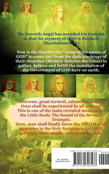 The Seventh Angel has sounded his trumpet already, that the mystery of GOD is finished! (Revelations 10.7) Now is the time for the "camp of the Saints of GOD" to come out from the false teachings of their churches (Mystery Babylon the Great)to gather, believe and fulfill for the installation of the Government of GOD here on earth. Otherwise, great calamities, turmoils, tribulations, etc. shall be experienced by all nations. This is one of the main revealed messages of the Little Book: The Sound of the Seventh Trumpet. Here, man shall know the TRUTH of all the mysteries of the Holy Scriptures; i.e. GOD, angels, man, creation, government of GOD on earth, great harvest, reincarnation, etc.