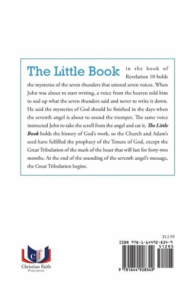 The Little Book in the book of Revelation 10 holds the mysteries of the seven thunders that uttered seven voices. When John was about to start writing, a voice from the heaven told him to seal up what the seven thunders said and never to write it down. He said the mysteries of God should be finished in the days when the seventh angel is about to sound the trumpet. The same voice instructed John to take the scroll from the angel and eat it. The Little Book holds the history of God's work, so the Church and Adam's seed have fulfilled the prophecy of the Tenure of God, except the Great…mehr