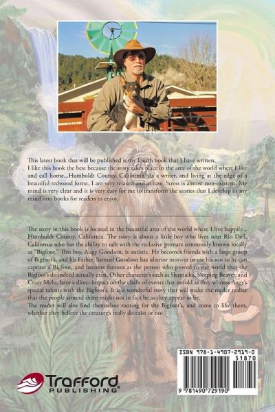 The story in this book is located in the beautiful area of the world where I live happily...Humboldt County, California. The story is about a little boy who lives near Rio Dell, California who has the ability to talk with the reclusive primate commonly known locally as "Bigfoot." This boy, Augy Goodson, is autistic. He becomes friends with a large group of Bigfoot's, and his Father, Samuel Goodson has ulterior motives to use his son so he can capture a Bigfoot, and become famous as the person who proved to the world that the Bigfoot's do indeed actually exist. Other character's such as Shamieka, Sleeping Beaver, and Crazy Mylo, have a direct impact on the chain of events that unfold as they witness Augy's special talents with the Bigfoot's. It is a wonderful story that will make the reader realize that the people around them might not in fact be as they appear to be. The reader will also find themselves rooting for the Bigfoot's, and come to like them, whether they believe the creature's really do exist or not.