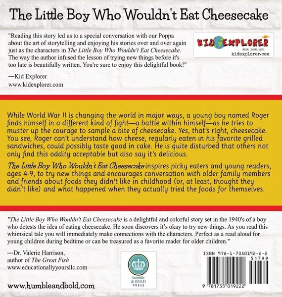 While World War II is changing the world in major ways, a young boy named Roger finds himself in a different kind of fight-a battle within himself-as he tries to muster up the courage to sample a bite of cheesecake. Yes, that's right, cheesecake. You see, Roger can't understand how cheese, regularly eaten in his favorite grilled sandwiches, could possibly taste good in cake. He is quite disturbed that others not only find this oddity acceptable but also say it's delicious. ¿The Little Boy Who Wouldn't Eat Cheesecake inspires picky eaters and young readers, ages 4-9, to try new things and encourages conversation with older family members and friends about foods they didn't like in childhood (or, at least, thought they didn't like) and what happened when they actually tried the foods for themselves. A timely book about a preconceived notion being challenged and overcome before it's too late.