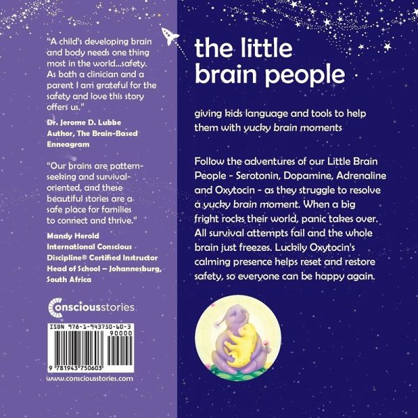 This imaginative book for ages 4 to 8 follows the adventures of our Little Brain People - Serotonin, Dopamine, Adrenaline and Oxytocin as they face a big fright. This starts a panic, throwing them into a yucky brain moment with survival reactions of fight, flight, and freeze. See how they reset and return to a state of calm, by breathing, moving and re-connecting with each other. Wonderfully illustrated and part of the Conscious ]Stories collection, this one-of-a-kind story will help children understand how their brain functions to help and protect them. The book ends with a detailed activity page with real-life tips on how to better manage yucky brain moments. Perfect for parents seeking conscious parenting tools!