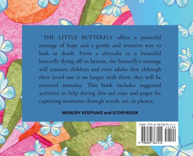 THE LITTLE BUTTERFLY: For Young Hearts Who Have Experienced Loss is a recipient of the prestigious Mom's Choice Award and the perfect gift to give a child after the death of a loved one. This colorfully illustrated story and memory book, offers a gentle and sensitive way to look at death. From chrysalis to a beautiful butterfly flying off to heaven, the Butterfly's message will reassure children and adults that although their loved one is no longer with them, they will be reunited someday. This book includes suggested activities to celebrate and remember their loved one and a Memory Book Section for recounting memories through writing, drawing, or pasting photos. This keepsake book can be opened whenever the child wishes to revisit the cherished memories they have captured. Included in the KEEPSAKE MEMORY and STORYBOOK: An "in memory of" page with space for a photo or drawingColorful illustrations and poem of the little Butterfly's journeyA blank line within the poem to personalize the Butterfly's messageSuggested activities to remember their loved oneA Memory Book section for drawings, photos, and writing. Note from the author: This book was intended for universal appeal and uses animal and insect characters. It would be acceptable to most who believe in an afterlife of some kind and would make a wonderful gift for a child who has lost a loved one. The Mom's Choice Awards(R) (MCA) evaluates products and services created for parents and educators and is globally recognized for establishing the benchmark in excellence in family-friendly media, products and services. Using a rigorous evaluation process, entries are scored on a number of elements including production quality, design, educational value, entertainment value, originality, appeal and cost. Around the world, parents, educators, retailers and members of the media trust the MCA Honoring Excellence seal when selecting quality products and services for families and children.