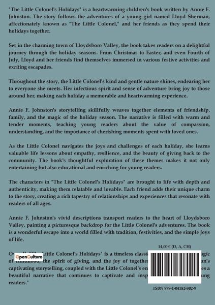 "The Little Colonel's Holidays" is a heartwarming children's book written by Annie F. Johnston. The story follows the adventures of a young girl named Lloyd Sherman, affectionately known as "The Little Colonel," and her friends as they spend their holidays together. Set in the charming town of Lloydsboro Valley, the book takes readers on a delightful journey through the holiday seasons. From Christmas to Easter, and even Fourth of July, Lloyd and her friends find themselves immersed in various festive activities and exciting escapades. Throughout the story, the Little Colonel's kind and gentle nature shines, endearing her to everyone she meets. Her infectious spirit and sense of adventure bring joy to those around her, making each holiday a memorable and heartwarming experience. Annie F. Johnston's storytelling skillfully weaves together elements of friendship, family, and the magic of the holiday season. The narrative is filled with warm and tender moments, teaching young readers about the value of compassion, understanding, and the importance of cherishing moments spent with loved ones. As the Little Colonel navigates the joys and challenges of each holiday, she learns valuable life lessons about empathy, resilience, and the beauty of giving back to the community. The book's thoughtful exploration of these themes makes it not only entertaining but also educational and enriching for young readers. The characters in "The Little Colonel's Holidays" are brought to life with depth and authenticity, making them relatable and lovable. Each friend adds their unique charm to the story, creating a rich tapestry of relationships and experiences that resonate with readers of all ages. Annie F. Johnston's vivid descriptions transport readers to the heart of Lloydsboro Valley, painting a picturesque backdrop for the Little Colonel's adventures. The book is a wonderful escape into a world filled with tradition, festivities, and the simple joys of life. Overall, "The Little Colonel's Holidays" is a timeless classic that celebrates the magic of childhood, the spirit of giving, and the joy of togetherness. Annie F. Johnston's captivating storytelling, coupled with the Little Colonel's endearing character, creates a beautiful narrative that continues to captivate and inspire generations of young readers."