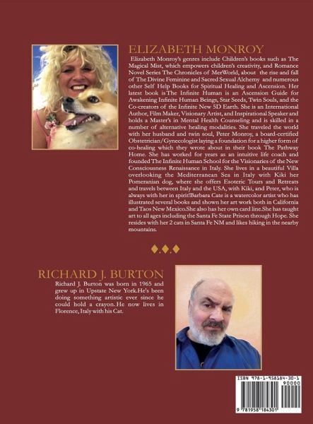 Elizabeth Monroy's genres include Children's books such as The Magical Mist, which empowers children's creativity, a Romance Novel Series The Chronicles of MerWorld, about the rise and fall of The Divine Feminine and Sacred Sexual Alchemy, and numerous other Self Help Books for Spiritual Healing and Ascension. Her latest book is The Infinite Human, an Ascension Guide for Awakening Infinite Human Beings, Star Seeds, Twin Souls, and the Co-creators of the Infinite New 5D Earth. She is an International Author, Film Maker, Visionary Artist, and Inspirational Speaker and holds a Master's in Mental Health Counseling, and is skilled in a number of alternative healing modalities. She traveled the world with her husband and twin soul, Peter Monroy, a board-certified Obstetrician/Gynecologist laying a foundation for a higher form of co-healing which they wrote about in their book The Pathway Home. She has worked for years as an intuitive life coach and founded The Infinite Human School for the Visionaries of the New Consciousness Renaissance School in Florence, Italy. She and she offers Esoteric Infinite Human Tours, workshops and co-creates eco communities all around the world, with Kiki, and Peter, who is always with her in spirit! And host The infinite Human Talk Show on Voice America's Empowerment Channel.